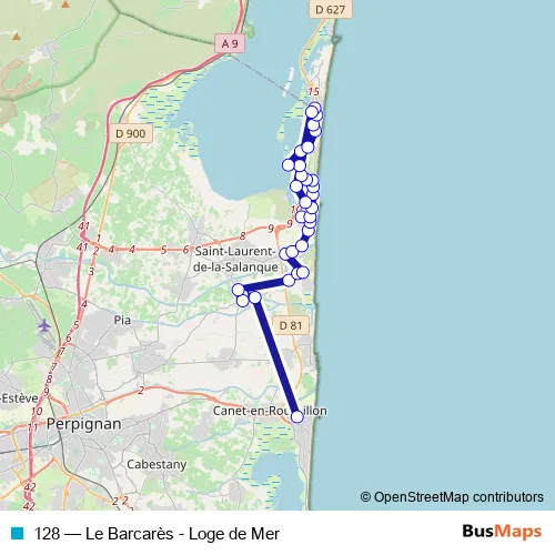 Bus 128 - Le Barcarès - Loge de Mer in Perpignan: Stops & Timetable