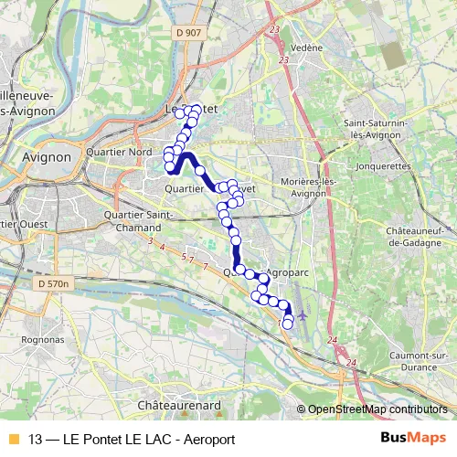 The first stop of the 13 bus route is Le Lac and the last stop is Aéroport. 13 (LE Pontet LE LAC - Aeroport) is operational during en semaine.
