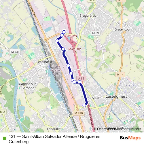 The first stop of the 131 bus route is Bruguières Gutenberg and the last stop is St-Alban Salvador Allende. 131 (Saint-Alban Salvador Allende / Bruguières Gutenberg) is operational during en semaine.