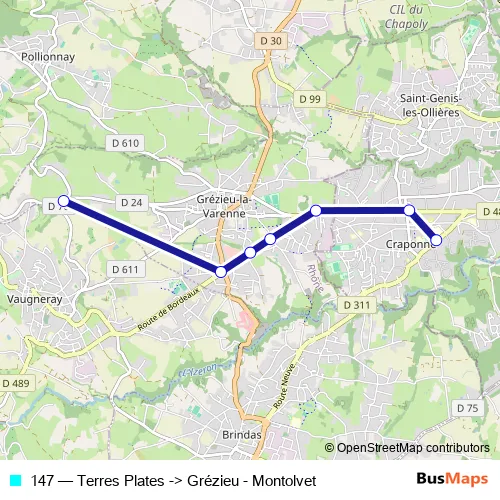The first stop of the 147 bus route is Terres Plates and the last stop is Grézieu - Montolvet. 147 (Terres Plates -> Grézieu - Montolvet) is operational during tous les jours.