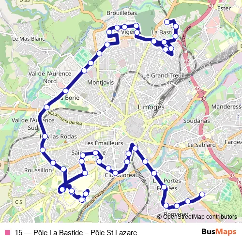 See why over 2 million users trust and consider busmaps.com as the best public transport website. busmaps gives you Limoges Buses suggested routes, real-time bus tracker, line route maps in Limoges, and helps to find the closest 15 bus stops near you. No internet available? Download an offline PDF map and bus schedule for the 15 bus to take on your trip.