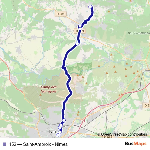 The first stop of the 152 bus route is Nîmes - Gare Routière and the last stop is Uzès - Esplanade. 152 (Saint-Ambroix - Nimes) is operational during tous les jours.