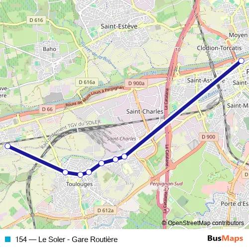 The first stop of the 154 bus route is Les Meravelles and the last stop is Gare Routière Méditerranée. 154 (Le Soler - Gare Routière) is operational during en semaine.