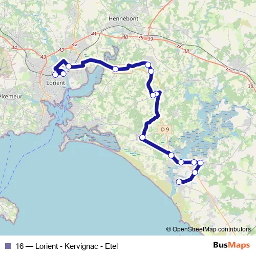 The first stop of the 16 bus route is Gare Routière and the last stop is Gare d'échanges. 16 (Lorient - Kervignac - Etel) is operational during tous les jours.