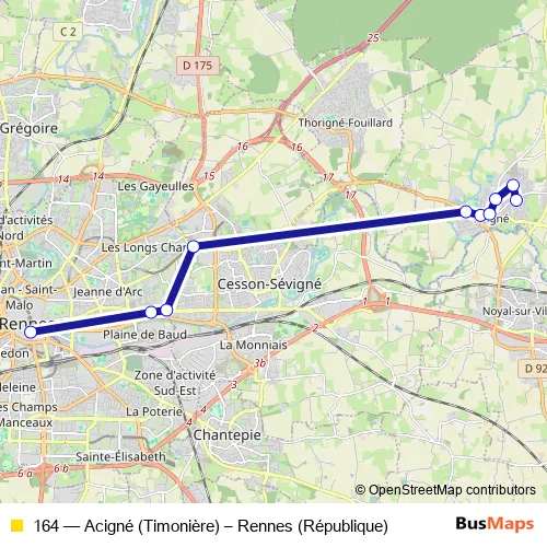 The first stop of the 164 bus route is République and the last stop is Timonière. 164 (Acigné (Timonière) – Rennes (République)) is operational during en semaine.