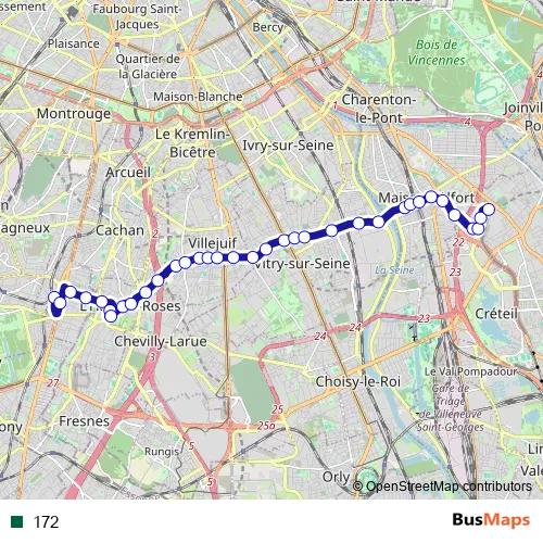 The first stop of the 172 bus route is Bourg-la-Reine Rer and the last stop is Hôpital Henri Mondor. 172 is operational during tous les jours.