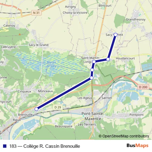 The first stop of the 183 bus route is Collège Réné Cassin Brenouille and the last stop is Place Sacy-LE-Petit. 183 (Collège R. Cassin Brenouille) is operational during en semaine.
