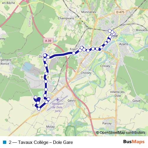 The first stop of the 2 bus route is Tavaux Collège and the last stop is Dole Gare. 2 (Tavaux Collège – Dole Gare) is operational during tous les jours.