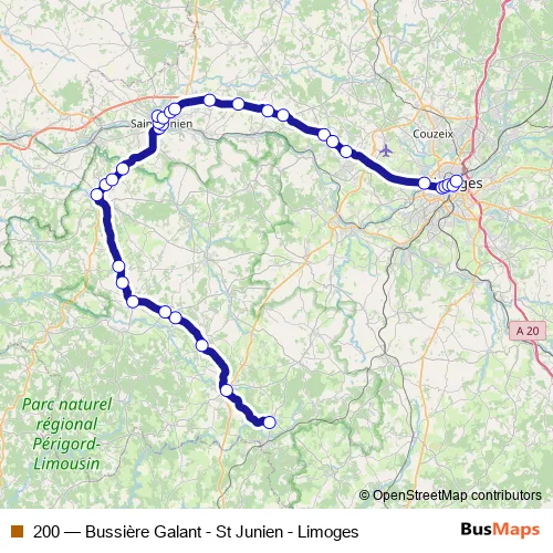 The first stop of the 200 bus route is Bourg and the last stop is Terminal Cars. 200 (Bussière Galant - St Junien - Limoges) is operational during tous les jours.