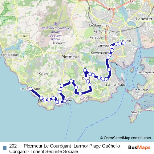 The first stop of the 202 bus route is Sécurité Sociale and the last stop is Le Courégant. 202 (Plœmeur Le Courégant -Larmor Plage Quéhello Congard - Lorient Sécurité Sociale) is operational during en semaine.