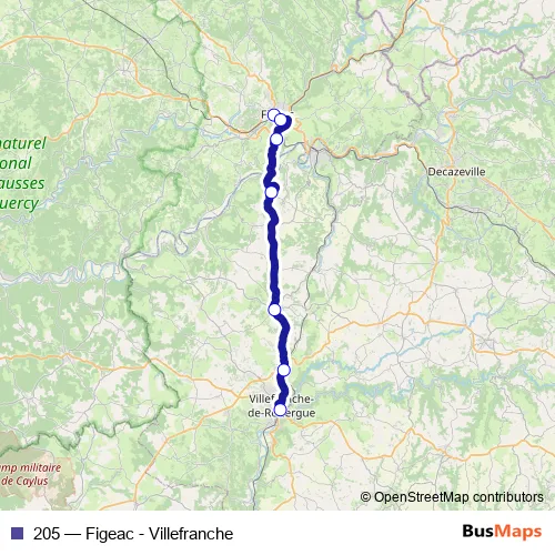 The first stop of the 205 bus route is Figeac - Gare Routière and the last stop is Villefranche-DE-Rouergue - Gare Sncf. 205 (Figeac - Villefranche) is operational during en semaine.