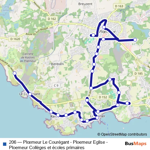 Services on the 206 - Plœmeur Le Courégant - Ploemeur Eglise - Ploemeur Collèges et écoles primaires bus start at 15:50 on lundi, mardi, mercredi, jeudi, vendredi.