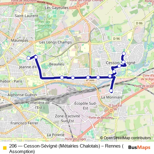 Bus 206 - Cesson-Sévigné (Métairies Chalotais) – Rennes (Assomption): Full Schedule in Rennes