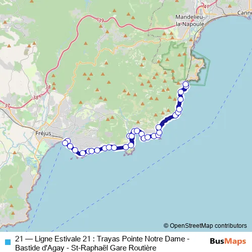 The first stop of the 21 bus route is Saint-Raphaël Gare Routière (Quai H) and the last stop is Trayas Pointe Notre Dame. 21 (Ligne Estivale 21 : Trayas Pointe Notre Dame - Bastide d'Agay - St-Raphaël Gare Routière) is operational during tous les jours.