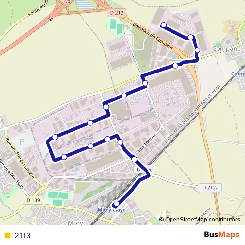 The first stop of the 2113 bus route is Gare de Mitry - Claye and the last stop is Saint-Exupéry. 2113 is operational during en semaine.