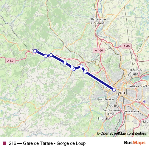 The first stop of the 216 bus route is Gorge de Loup and the last stop is Tarare Gare. 216 (Gare de Tarare - Gorge de Loup) is operational during tous les jours.