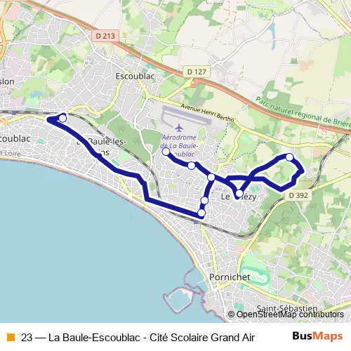 The first stop of the 23 bus route is Ville Halgand and the last stop is Lycée Grand Air. 23 (La Baule-Escoublac - Cité Scolaire Grand Air) is operational during en semaine.