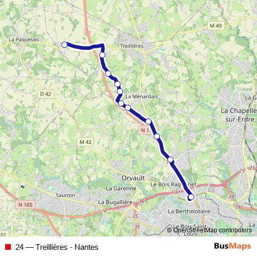 The first stop of the 24 bus route is Le Cardo and the last stop is Muzon. 24 (Treillières - Nantes) is operational during tous les jours.