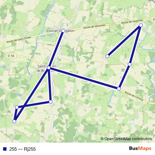 The first stop of the 255 bus route is Saint-Nizier-le-Bouchoux-Saint-Nizier-LE-Bouchoux - Grand Nanciat-SNI-Grand Nanc and the last stop is Curciat-Dongalon-Curciat-Dongalon - Ecole Primaire-CUR-Ecole Prim. 255 (Rj255) is operational during tous les jours.