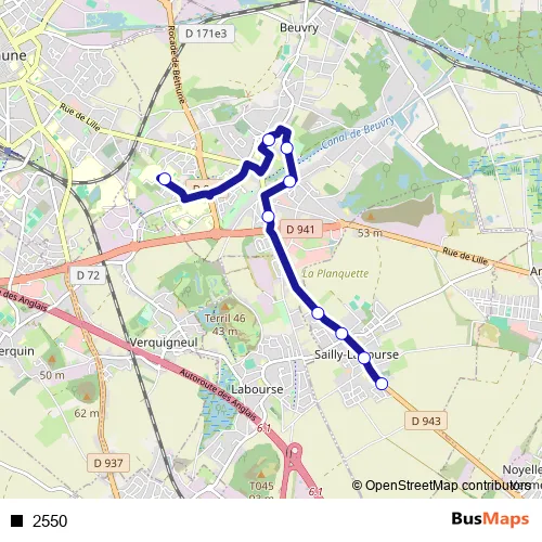 See why over 2 million users trust and consider busmaps.com as the best public transport website. busmaps gives you Sailly-Labourse Buses suggested routes, real-time bus tracker, line route maps in Sailly-Labourse, and helps to find the closest 2550 bus stops near you. No internet available? Download an offline PDF map and bus schedule for the 2550 bus to take on your trip.