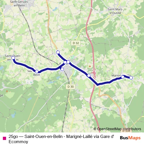 The first stop of the 25go bus route is Saint Ouen EN Belin Mairie and the last stop is Marigné Laillé Fimurex. 25go (Saint-Ouen-en-Belin - Marigné-Laillé via Gare d'Ecommoy) is operational during en semaine.