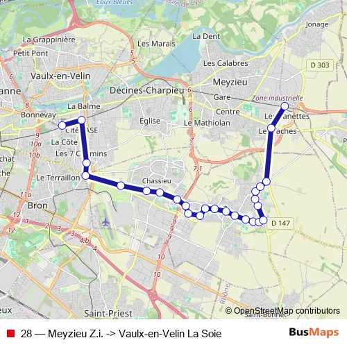 The first stop of the 28 bus route is Vaulx-en-Velin La Soie and the last stop is Meyzieu Z.i.. 28 (Meyzieu Z.i. -> Vaulx-en-Velin La Soie) is operational during tous les jours.
