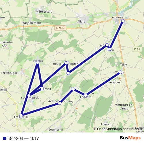 The first stop of the 3-2-304 bus route is Airaines - Collège G.M. Scellier and the last stop is Warlus - Abri. 3-2-304 (1017) is operational during tous les jours.