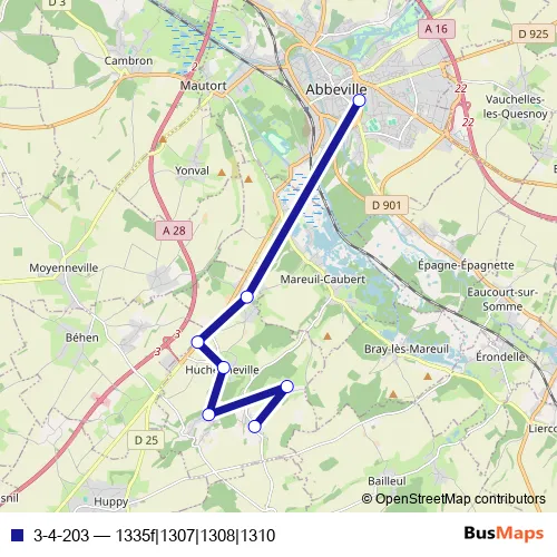The first stop of the 3-4-203 bus route is Abbeville - Cité scolaire and the last stop is Huchenneville - Caumont - Abri Place. 3-4-203 (1335f|1307|1308|1310) is operational during tous les jours.