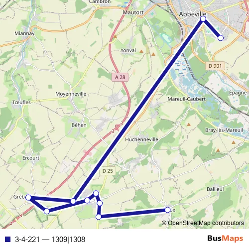 The first stop of the 3-4-221 bus route is Abbeville - Collège Ponthieu and the last stop is Limeux - Mairie. 3-4-221 (1309|1308) is operational during tous les jours.