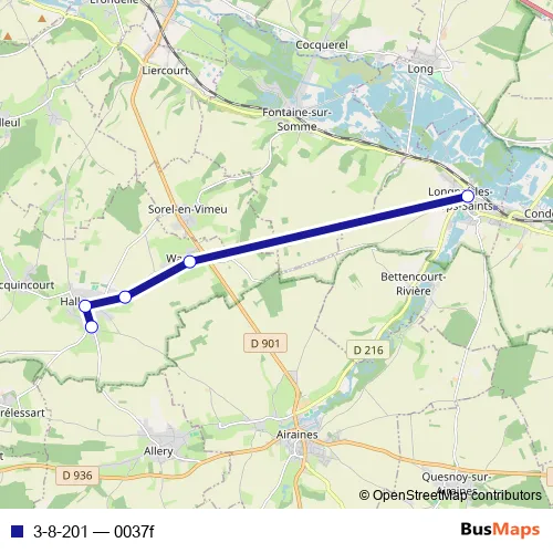 The first stop of the 3-8-201 bus route is Longpre-LES-Corps-Saints - Collège des Cygnes and the last stop is Hallencourt - Route d'Allery. 3-8-201 (0037f) is operational during tous les jours.