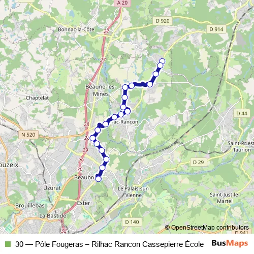 The first stop of the 30 bus route is Rilhac Rancon Cassepierre École and the last stop is Pôle Fougeras quai E. 30 (Pôle Fougeras – Rilhac Rancon Cassepierre École) is operational during tous les jours.