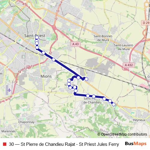 The first stop of the 30 bus route is Saint-Priest Jules Ferry and the last stop is St-P.de-Chandieu - Rajat. 30 (St Pierre de Chandieu Rajat - St Priest Jules Ferry) is operational during en semaine.