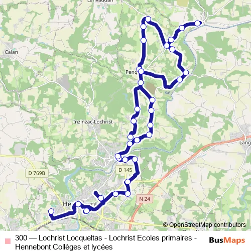 The first stop of the 300 bus route is Place Foch and the last stop is Kersalo. 300 (Lochrist Locqueltas - Lochrist Ecoles primaires - Hennebont Collèges et lycées) is operational during en semaine.