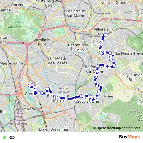 See why over 2 million users trust and consider busmaps.com as the best public transport website. busmaps gives you Creteil Buses suggested routes, real-time bus tracker, line route maps in Creteil, and helps to find the closest 308 bus stops near you. No internet available? Download an offline PDF map and bus schedule for the 308 bus to take on your trip.