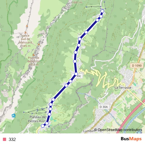 The first stop of the 332 bus route is Plateau-des-Petites-Roches, École Les Gandins and the last stop is Plateau-des-Petites-Roches, Col de Marcieu. 332 is operational during tous les jours.