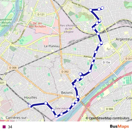 The first stop of the 34 bus route is Marché des Côteaux and the last stop is Pont de Bezons. 34 is operational during tous les jours.