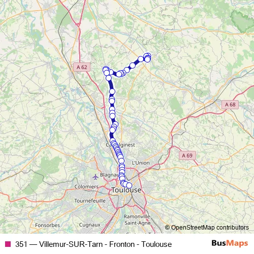 The first stop of the 351 bus route is Villemur-SUR-Tarn - Place Saint-Jean and the last stop is Toulouse - Gare Routière. 351 (Villemur-SUR-Tarn - Fronton - Toulouse) is operational during tous les jours.