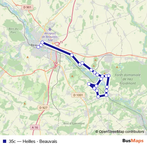 The first stop of the 35c bus route is Gare Routière and the last stop is Centre. 35c (Heilles - Beauvais) is operational during tous les jours.