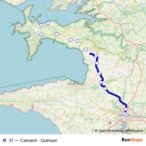 The first stop of the 37 bus route is Gare Routière Sncf and the last stop is Port. 37 (Camaret - Quimper) is operational during tous les jours.