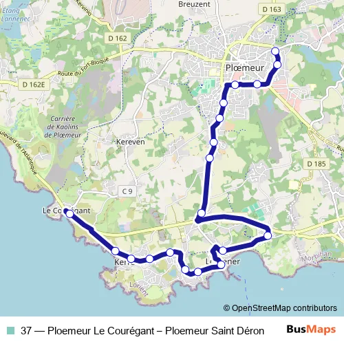 The first stop of the 37 bus route is Kerjoël and the last stop is Le Courégant. 37 (Ploemeur Le Courégant – Ploemeur Saint Déron) is operational during tous les jours.