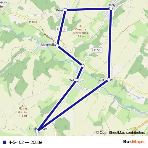 The first stop of the 4-5-102 bus route is Mezerolles - Ecole and the last stop is Mezerolles - Ecole. 4-5-102 (2083e) is operational during tous les jours.