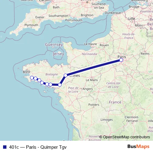 The first stop of the 401c rail route is Paris Montparnasse Hall 1 - 2 and the last stop is Quimper. 401c (Paris - Quimper Tgv) is operational during tous les jours.