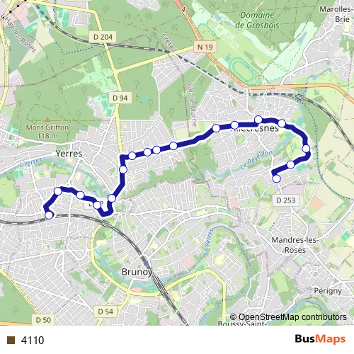 The first stop of the 4110 bus route is Radio and the last stop is Gare de Yerres. 4110 is operational during tous les jours.
