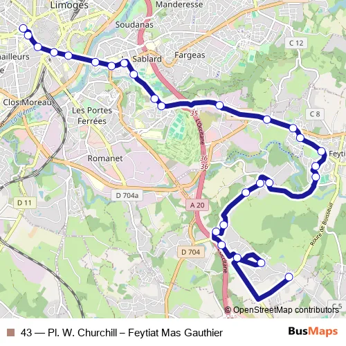 The first stop of the 43 bus route is Pl. W. Churchill quai D and the last stop is Feytiat Mas Gauthier. 43 (Pl. W. Churchill – Feytiat Mas Gauthier) is operational during en semaine.