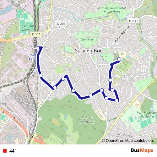 The first stop of the 441 bus route is Collège du Fort and the last stop is Gare de Sucy-Bonneuil. 441 is operational during en semaine.