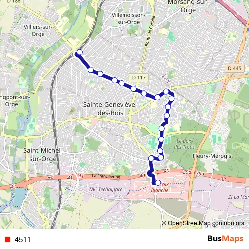 The first stop of the 4511 bus route is Gare de Sainte-Geneviève-des-Bois and the last stop is ZI Croix Blanche. 4511 is operational during tous les jours.