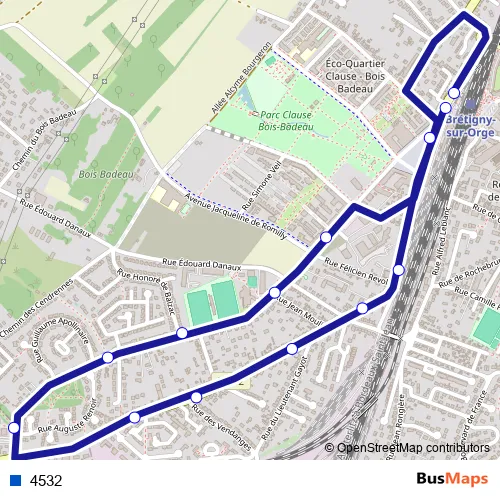 The first stop of the 4532 bus route is Brossolette Gare de Brétigny and the last stop is Gare de Brétigny. 4532 is operational during tous les jours.