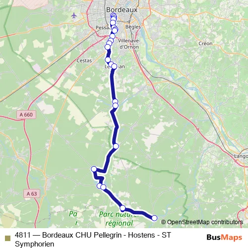 The first stop of the 4811 bus route is Hopital Pellegrin Est and the last stop is Pl. Michelet. 4811 (Bordeaux CHU Pellegrin - Hostens - ST Symphorien) is operational during tous les jours.