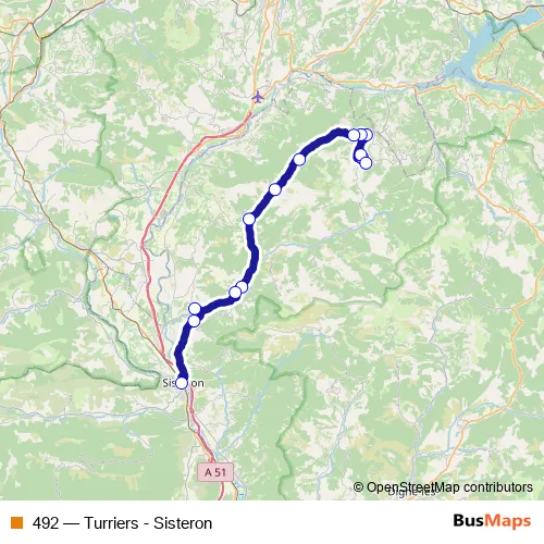 The first stop of the 492 bus route is Gendarmerie and the last stop is Gare Routière. 492 (Turriers - Sisteron) is operational during tous les jours.
