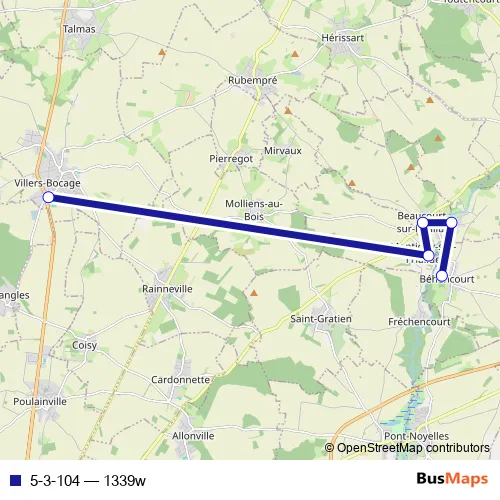 The first stop of the 5-3-104 bus route is Behencourt - Mairie and the last stop is Villers-Bocage - Collège les Coudriers. 5-3-104 (1339w) is operational during tous les jours.